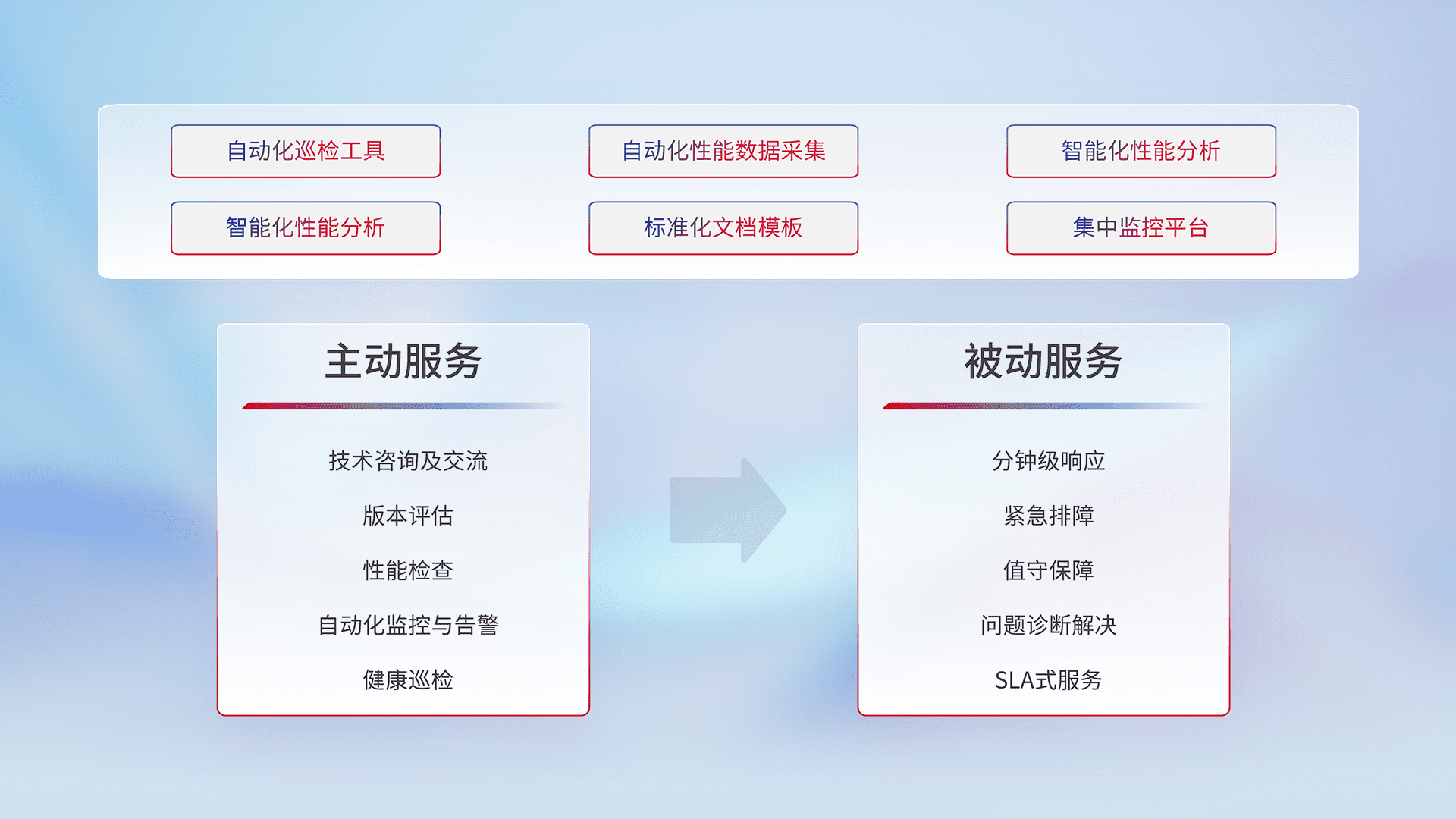 智能化工具和标准化文档,,,,保障服务质量,,,,提供主动服务(包含技术咨询、、、版本评估、、性能检查、、、、自动化监控与告警、、、、健康巡检)和被动服务包含(分钟级响应、、、紧急排障、、、、值守保障、、问题诊断解决、、、、SLA服务)。。。。